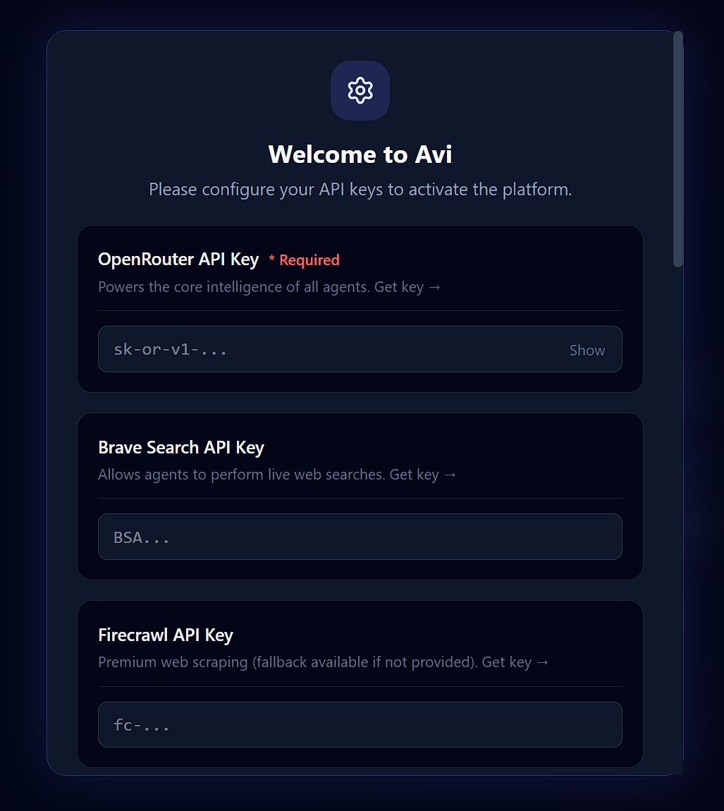 Paste all of the API keys you have and click Save and Continue at the bottom. You will then get to the dashboard home screen.
